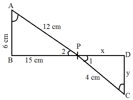 In $\triangle\text{ABP}$ and $\triangle\text{CDP},$| $\Rightarrow\frac{6}{\text{y}}=\frac{12}{4}=\frac{15}{\text{x}}$ | $\Rightarrow\frac{15}{\text{x}}=\frac{12}{4}$ |