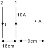 In figure two parallel infinitely long current carrying wires are shown. If resultant magnetic field at point $A$ is zero. Then determine current $I.$ (in $A$)