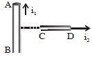 An infinitely long straight conductor $AB$ is fixed and a current is passed through it. Another movable straight wire $CD$ of finite length and carrying current is held perpendicular to it and released. Neglect weight of the wire
