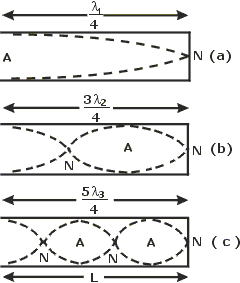 In the fundamental mode of vibration, the air column vibrates with an antinode A at the open end and a node $N$ at the closed end as shown in figure $(a).$ since the distance between a node and an antinode is $\frac{\lambda}{4}$, the length of the tube lin this case will be equal to $\frac{\lambda}{4}$ $l=\frac{\lambda}{4}$