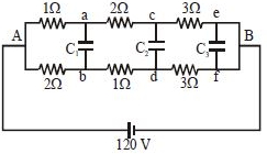 charge on $\mathrm{C}_{1}$ is $\mathrm{q}_{1}=\mathrm{C}_{1}\left(\mathrm{V}_{\mathrm{a}}-\mathrm{V}_{\mathrm{b}}\right)$