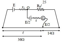 In order to measure the internal resistance $r_1$ of a cell of emf $E$, a meter bridge of wire resistance $R_0=50 \Omega$, a resistance $R_0 / 2$, another cell of emf $E / 2$ (internal resistance $r$ ) and a galvanometer $G$ are used in a circuit, as shown in the figure. If the null point is found at $l=72 cm$, then the value of $r_1=$ . . . . $\Omega$