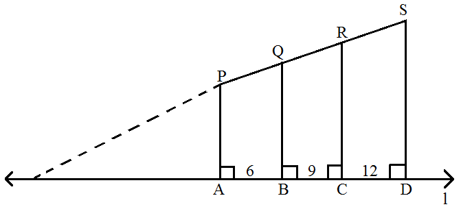 In PA, QB, RC and SD are all perpendiculars to a line l, AB = 6cm, BC = 9cm, CD = 12cm and SP = 36cm. Find PQ, QR and RS.