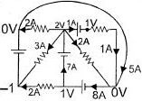 In the circuit diagram shown, each battery is ideal having an e.m.f. of $1\ volt$. Each resistor has a resistance of $1\Omega $ Ammotor$(A)$ has a resistance of $1\Omega $ Find the reading of the ammeter and the total thermal power produced in the circuit