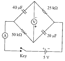 ($A$) The voltmeter displays $-5 \mathrm{~V}$ as soon as the key is pressed, znd displays $+5 \mathrm{~V}$ after a long time