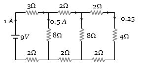 Main current $i = \frac{V}{R} = \frac{9}{9} = 1\,A$