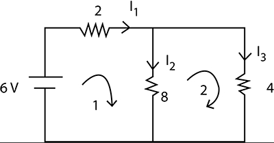 $2 I_{1}+8 I_{2}=6 \Rightarrow I_{1}+4 I_{2}=3 \ldots . .(1)$