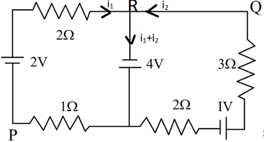 In the circuit drawn in currents allotted, apply Kirchoffs Voltage Law in first loop,