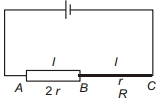 In the following diagram, the lengths of wires $A B$ and $B C$ are equal, but the radius of wire $A B$ is double that of $B C$. The ratio of potential gradient on wires $A B$ and on $B C$ will be (wires are made of same material)