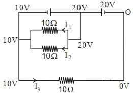 d $I_1=I_2=\frac{20-10}{10}=1\,A$