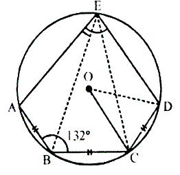 In the figure, O is the centre of circle, with AB = BC = CD. Also, ∠ABC = 132° Arc CD subtends ∠COD at the centre and ∠CED at the remaining part of the circle. ∴ COD = 2∠CED = 2 × 24° = 48°