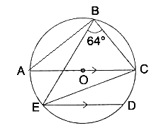 Join AB, ∠ABC = 90° (Angle in a semi circle) ∴ ∠ABE = 90° - 64° = 26° Now, ∠ABE = ∠ACE = 26° (Angle in the same segment) Also, AC || ED ∴ ∠DEC = ∠ACE = 26° (Alternate angles)