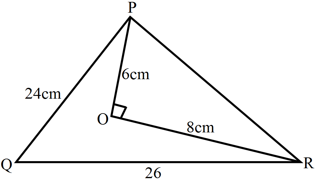 In $\triangle\text{POR},$ $\text{PR}^2=\text{PO}^2+\text{OR}^2$ $\text{PR}^2=(6^2+8^2)\text{cm}^2$ $=(36+64)\text{cm}^2=100\text{cm}^2$ $\text{PR}=\sqrt{100}\text{cm}=10\text{cm}$ In $\triangle\text{PQR},$ By Pythagoras theoram, we have $\text{QR}^2=\text{QP}^2+\text{PR}^2$ $(26)^2\text{cm}^2=\Big(24^2+10^2\Big)\text{cm}^2$ $676\text{cm}^2=(576+100)\text{cm}^2$ $676\text{cm}^2=676\text{cm}^2$ Hence, $\text{QR}^2=\text{QP}^2+\text{PR}^2$(sum of square of two sides equal to square of greatest side) Hence, $\triangle\text{PQR}$ is a right triangle which ois right angled at P.
