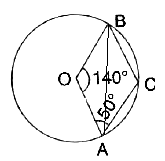 Here, $\angle A C B=\frac{1}{2} \operatorname{Reflex}(\angle AOB )=\frac{1}{2}\left(360^{\circ}-140^{\circ}\right)=110^{\circ}$ (Angle at the centre is double the angle at the circumference subtended by the same chord) Now, OA = OB (Radii of same circle) $\therefore \angle OBA =\angle OAB =\frac{180^{\circ}-140^{\circ}}{2}=20^{\circ}$ ∴ ∠CAB = 50° - 20°= 30° ΔCAB, ∠CBA - 180° -110°- 30° = 40° ∴ ∠OBC = ∠CBA + ∠OBA = 40° + 20° = 60°