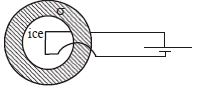 Figure shows a thick shell made of electrical conductivity $\sigma$ and has inner & outer radii of $10\ cm$ & $20\ cm$ respectively and is filled with ice inside it. Its inside and outside surface are kept at different potentials by a battery of internal resistance $\frac{2}{\pi} \Omega \ \&\ \epsilon = 5V$. Find value of $\sigma$ for which ice melts at maximum possible rate if $25\%$ of heat generated by shell due to joule heating is used to melt ice.
