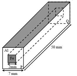 In an aluminium $(A1)$ bar of square cross section, a square hole is drilled and is filled with iron ( $Fe$ ) as shown in the figure. The electrical resistivities of $A 1$ and $Fe$ are $2.7 \times 10^{-8} \ \Omega m$ and $1.0 \times 10^{-7} \ \Omega m$, respectively. The electrical resistance between the two faces $P$ and $Q$ of the composite bar is