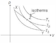 As we move along line $X Y$, it cuts a isotherm at higher temperature $\left(T_2 > T_3\right)$