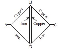 Six wire each of cross-sectional area $A$ and length $l$ are combined as shown in the figure. The thermal conductivities of copper and iron are $K_1$ and $K_2$ respectively. The equivalent thermal resistance between points $A$ and $C$ is :-