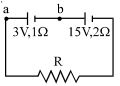 Two batteries one of the $\mathrm{emf}$ $3\,V$, internal resistance $1$ ohm and the other of $\mathrm{emf}$ $15\, V$, internal resistance $2$ $\mathrm{ohm}$ are connected in series with a resistance $R$ as shown. If the potential difference between $a$ and $b$ is zero the resistance of $R$ in $\mathrm{ohm}$ is