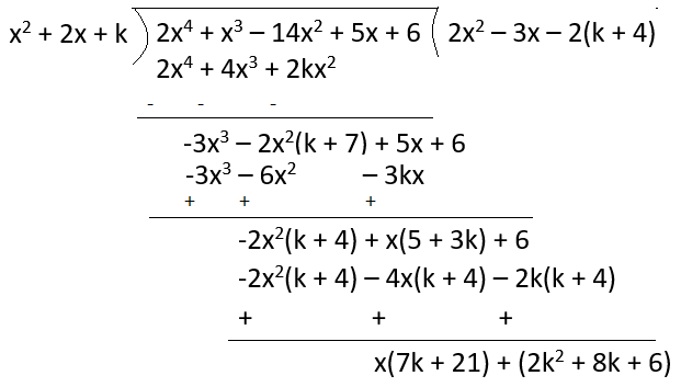 यदि $g(x) = x^2 + 2x + k, f(x) = 2x^4 + x^3 - 14x^2 + 5x + 6$ का एक गुणनखंड है, तो शेषफल शून्य होता है जब $f(x)$ को $g(x)$ से विभाजित किया जाता है।