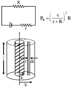 Model a torch battery of length $l$ to be made up of a thin cylindrical bar of radius $'a'$ and a concentric thin cylindrical shell of radius ' $b$ ' fille in between with an electrolyte of resistivity $\rho$ (see figure). If the battery is connected to a resistance of value $R ,$ the maximum Joule heating in $R$ will take place for