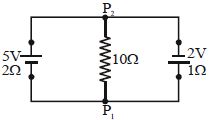 A $5\, V$ battery with internal resistance $2\, \Omega$ and a $2\,V$ battery internal resistance $1\, \Omega$ are connected to a $10\, \Omega$ resistor as shown in the figure. The current in the $10\, \Omega$ resistor is :-