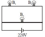 A $100\, W \, bulb\, B_1$ and two $60\, W \,bulbs \,B_2$ and $B_3$, are connected to a $220\, V$ source, as shown in Figure. Now $P_1, P_2$ and $P_3$ are the output powers of the bulbs $B_1, B_2$ and $B_3$ respectively. Then