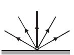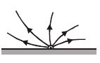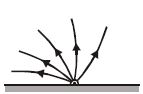 On a windless day, sound emanate isotropically from a point source. Rays of the sound waves emanated from a point source placed close to ground are shown in the figure. Consider horizontal wind towards the left blowing with constant velocity, which is uniform everywhere. In the following figures, rays of sound waves in presence of the wind are shown. Which one is the most correct representation?