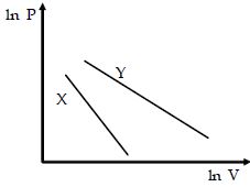 For two different gases $X$ and $Y,$ having degrees of freedom $f_1$ and $f_2$ and molar heat capacities at constant volume $C_{v_1}$ and $C_{v_2}$ respectively, for adiabatic process , the $\ln P$ versus $\ln V$ graph is plotted as shown :-
