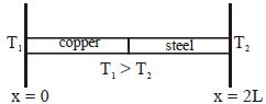If heat flows through them from $x = 0$ to $x = 2L$ at a steady rate and conductivities of the metals are $K_{cu}$ and $K_{steel}$ $(K_{cu} > K_{steel}),$ then the temperature varies as (convection and radiation are negligible)