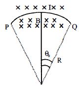 A wire carrying current $I$ is tied between points $P$ and $Q$ and is in the shape of a circular arc of radius $R$ due to a uniform magnetic field $B$ (perpendicular to the plane of the paper, shown by $\times \times \times $) in the vicinity of the wire. If the wire subtends an angle $2\theta_0$ at the centre of the circle (of which it forms an arc) then the tension in the wire is
