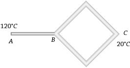 Five identical rods are joined as shown in figure. Point $A$ and $C$ are maintained at temperature $120^o C$ and $20^o C$ respectively. The temperature of junction $B$ will be....... $^oC$