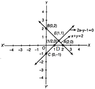 रेखाएँ $AB$ और $CD$ प्रतिच्छेद करती हैं $E(1, 1)$ पर इसलिए, अनंत रेखाएं रैखिक समीकरणों $x + y = 2$ और $2x - y - 1 = 0$ अर्थात $E (1, 1)$ के प्रतिच्छेदन बिंदु से होकर गुजर सकती हैं जैसे $y = x, x + 2y = 3, x + y = 2$ और इसी तरह।