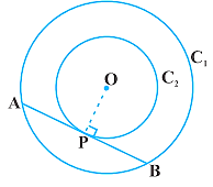 हमें केंद्र $O$ वाले दो सकेंद्रीय वृत्त $C_1$ और $C_2$ तथा बड़े वृत्त $C_1$ की जीवा $AB,$ जो छोटे वृत्त $C_2$ को बिंदु $P$ पर स्पर्श करती है, दिए हैं $($देखिए आकृति$)$।