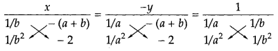 $ \Rightarrow x = \frac { a - b } { b ^ { 2 } } \times \frac { 1 } { \frac { a - b } { a ^ { 2 } b ^ { 2 } } } = a ^ { 2 }$ तथा $ y = \frac { a - b } { a ^ { 2 } } \times \frac { 1 } { \frac { a - b } { a ^ { 2 } b ^ { 2 } } } = b ^ { 2 }$