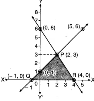 अतः दिए हुए रैखिक समीकरण रैखिक निरूपित रेखाओं एवं अक्ष से बने अभीष्ट त्रिभुज PQR के शीर्षों के अभीष्ट निर्देशांक: P (2, 3), Q(-1, 0) और R (4, 0) हैं तथा प्राप्त त्रिभुजाकार पटल को उपर्युक्त आकृति में छायांकित किया गया है।