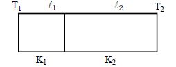 One end of a thermally insulated rod is kept at a temperature $T_1$ and the other at $T_2$. The rod is composed of two sections of lengths $l_1$ and $l_2$ and thermal conductivities $K_1$ and $K_2$ respectively. The temperature at the interface of the two sections is