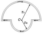 In the figure shown there are two semicircles of radii ${r_1}$ and ${r_2}$ in which a current $i$ is flowing. The magnetic induction at the centre $O$ will be