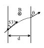 A particle moving with velocity v having specific charge $(q/m)$ enters a region of magnetic field $B$ having width $d=\frac{{3mv}}{{5qB}}$ at angle $53^o$ to the boundary of magnetic field. Find the angle $\theta$ in the diagram......$^o$
