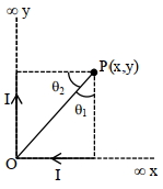 There are two infinitely long straight current carrying conductors and they are held at right angles to each other so that their common ends meet at the origin as shown in the figure given below. The ratio of current in both conductor is $1: 1$. The magnetic field at point $P$ is ...... .