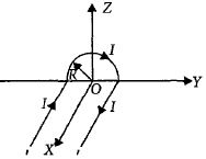 A wire carrying current $I$ has the shape as shown in adjoining figure.Linear parts of the wire are very long and parallel to $X-$axis while semicircular portion of radius $R$ is lying in $Y-Z$ plane. Magnetic field at point $O$ is