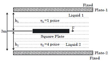 A thin square plate of side $2\ m$ is moving at the interface of two very viscous liquids of viscosities ${\eta _1} = 1$ poise and ${\eta _2} = 4$ poise respectively as shown in the figure. Assume a linear velocity distribution in each fluid. The liquids are contained between two fixed plates. $h_1 + h_2 = 3\ m$ . A force $F$ is required to move the square plate with uniform velocity $10\ m/s$ horizontally then the value of minimum applied force will be ........ $N$