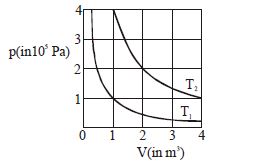 The given diagram shows isotherms for a fixed mass of an ideal gas at temperature $T_1$ and $T_2$ . What is the value of the ratio $\frac{{{\text{r}}{\text{.m}}{\text{.s}}{\text{. speed of the molecules at temperature }}{{\text{T}}_{2{\text{ }}}}}}{{{\text{r}}{\text{.m}}{\text{.s}}{\text{. speed of the molecules at temperature }}{{\text{T}}_1}}}$ ?