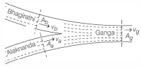 As water is not stored anywhere. So, volume flow rate of Ganga $=$ volume flow rate of Bhagirathi + volume flow rate of Alaknanda