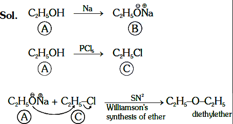 The compound $A$ on treatment with $Na$ gives $B,$ and with $\ce{PCI_{5 }}$ gives $C. B$ and $C$ react together to give diethyl ether. $A, B$ and $C$ are in the order.
