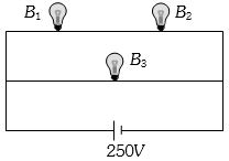 A $100\, W$ bulb $B_1$, and two $60\,W$ bulbs $B_2$ and $B_3$, are connected to a $250\, V$ source, as shown in the figure. Now $ W_1, W_2$ and $W_3$ are the output powers of the bulbs $B_1, B_2$ and $B_3$, respectively. Then