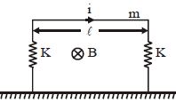 A horizontal metallic rod of mass $'m'$ and length $'l'$ is supported by two vertical identical springs of spring of spring constant $'K'$ each and natural length $l_0.$ A current $'i'$ is flowing in the rod in the direction shown. If the rod is in equilibrium then the length of each spring in this state is :-