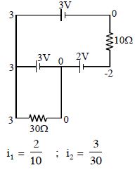 The current $i_1$ and $i_2$ through the resistor $R_1 (= 10\,\Omega )$ and $R_2 (=30 \,\Omega )$ in the circuit diagram with $E_1 = 3\,V, E_2 = 3\,V$ and $E_3 = 2\,V$ are respectively: