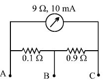 A milliammeter of range $10\, mA$ and resistance $9\, \Omega$ is joined in a circuit as shown. The meter gives full-scale deflection for current $I$ when $A$ and $B$ are used as its terminals, i.e., current enters at $A$ and leaves at $B$ ($C$ is left isolated). The value of $I$ is