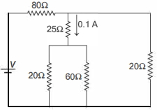 A current of $0.1 \,A$ flows through a $25 \,\Omega$ resistor represented by the circuit diagram. The current in $80 \,\Omega$ resistor is ........... $A$